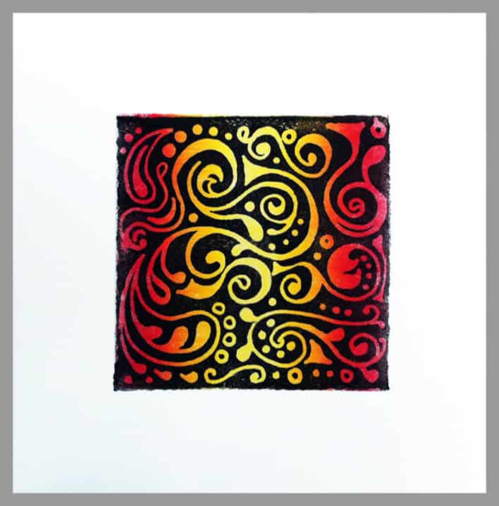 A Trip to the 60s explores the fantasy land of colorful, swirling, psychedelic shapes and colors that were so popular when I was growing up in the 60s. I carved a stamp, which I used to print black ink over an ink-rolled rainbow gradient. I think it's groovy! Peace, baby!