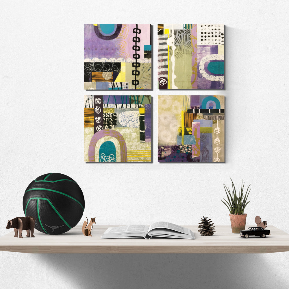 These "arch" paintings (four individual collage artworks) are displayed together as a single painting. All the papers in these works are unique, each one is hand-painted or printed.