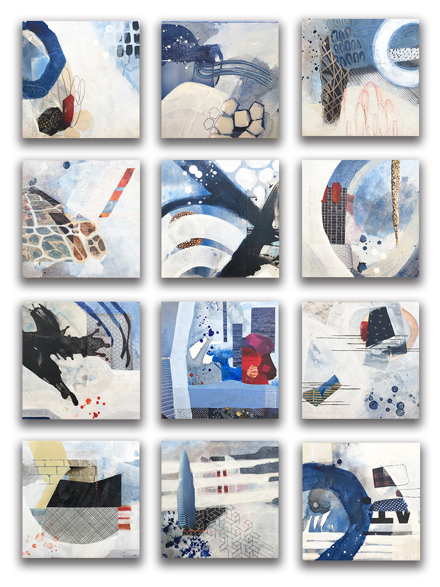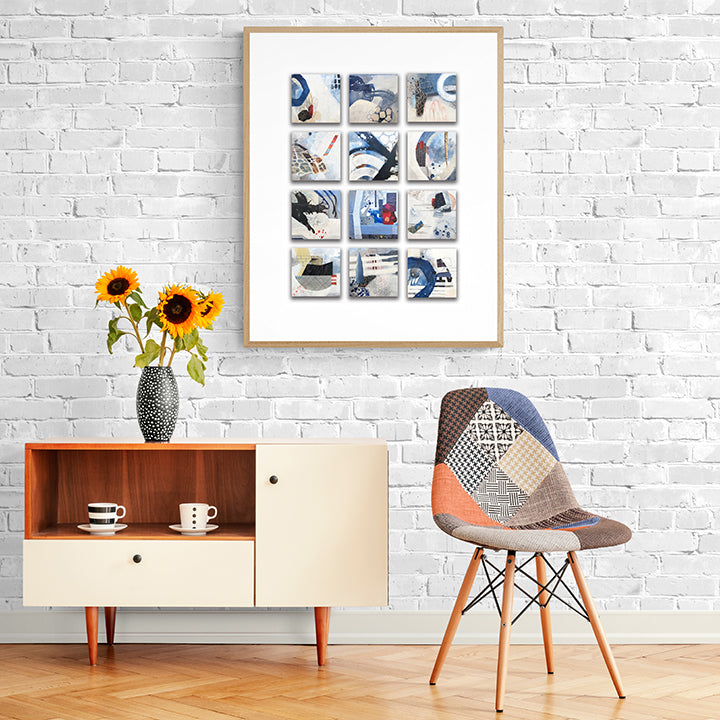 A colorful series of twelve architecturally inspired abstract paintings - 6"x 6"- hung together as a single artwork. The individual paintings can be rearranged and presented in different grid shapes to fit your wall space, horizontally or vertically.