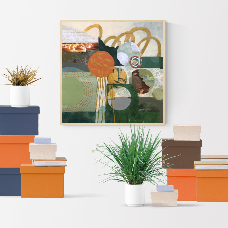 Autumn Memories, a 1970s retro-style geometric art painting in avocado green, harvest gold, and burnt orange. The colors remind me of my kitchen growing up in California. Doesn't it make you want to go out into the crisp fall air and jump into a big pile of leaves? Or play touch football in the front yard before the big Thanksgiving feast?