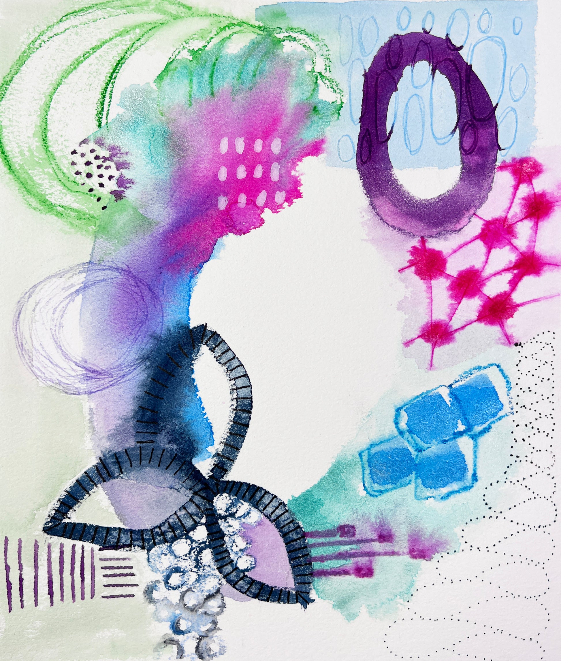 This artwork's a fiesta for your eyes! Colorful scribbles and playful doodles dance with vivid ink splashes, all set to a rhythm of geometric shapes and botanical sketches. It's pure fun on watercolor paper. Let yourself be swept away by this explosion of color and creativity.