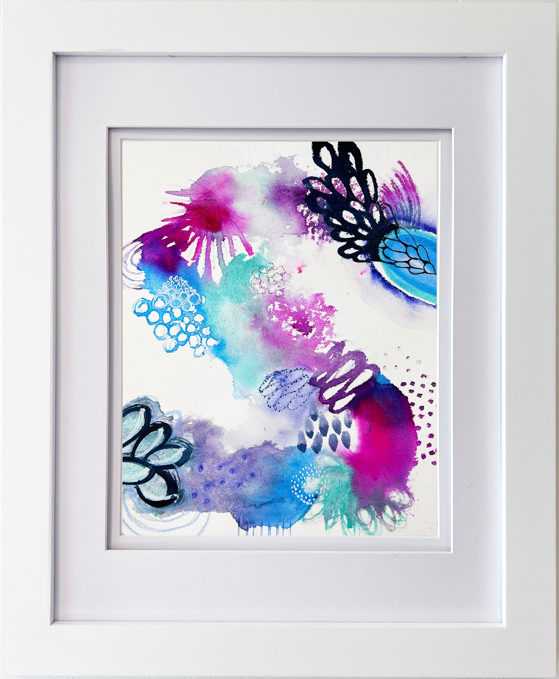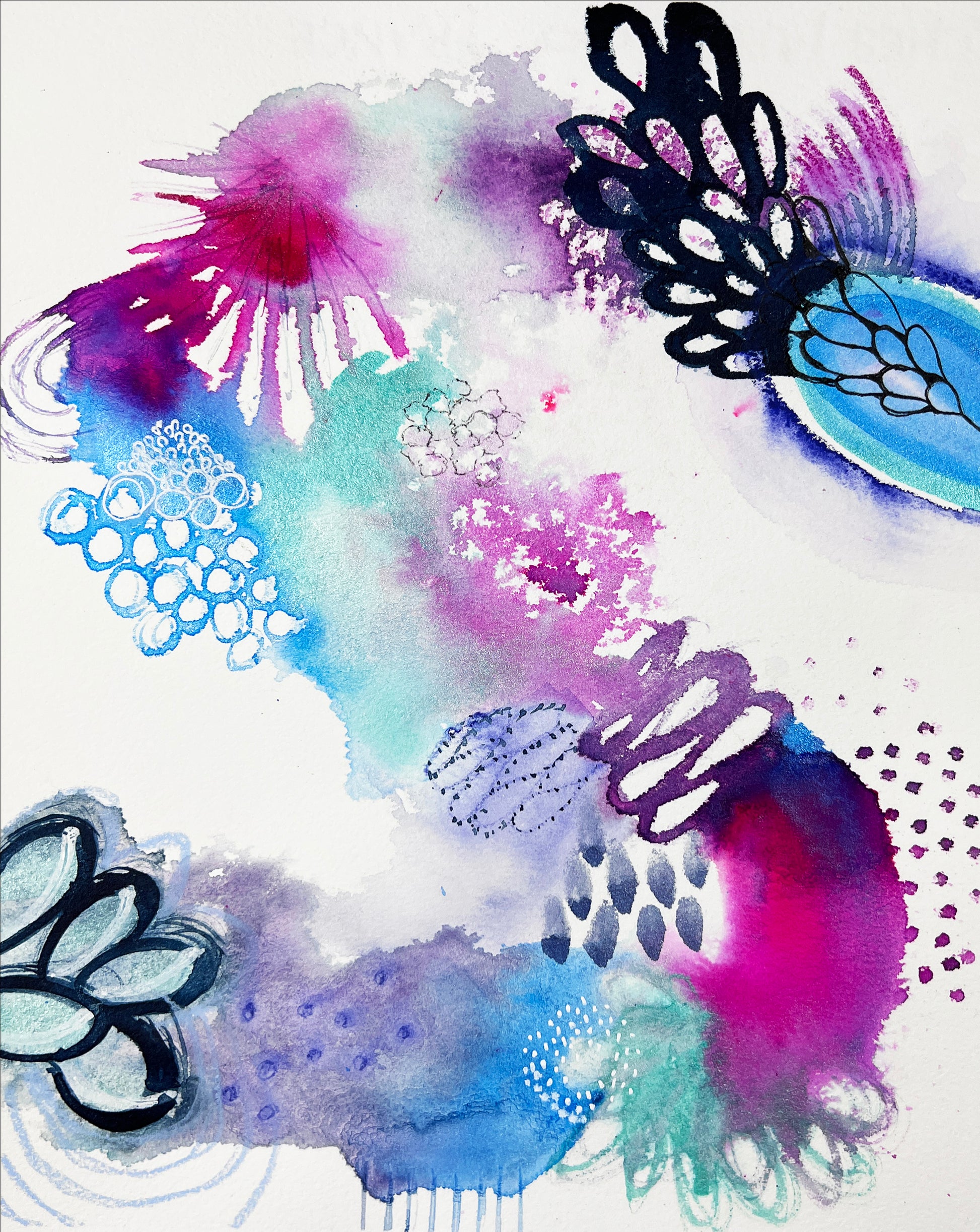 This artwork's a fiesta for your eyes! Colorful scribbles and playful doodles dance with vivid ink splashes, all set to a rhythm of geometric shapes and botanical sketches. It's pure fun on watercolor paper. Let yourself be swept away by this explosion of color and creativity.