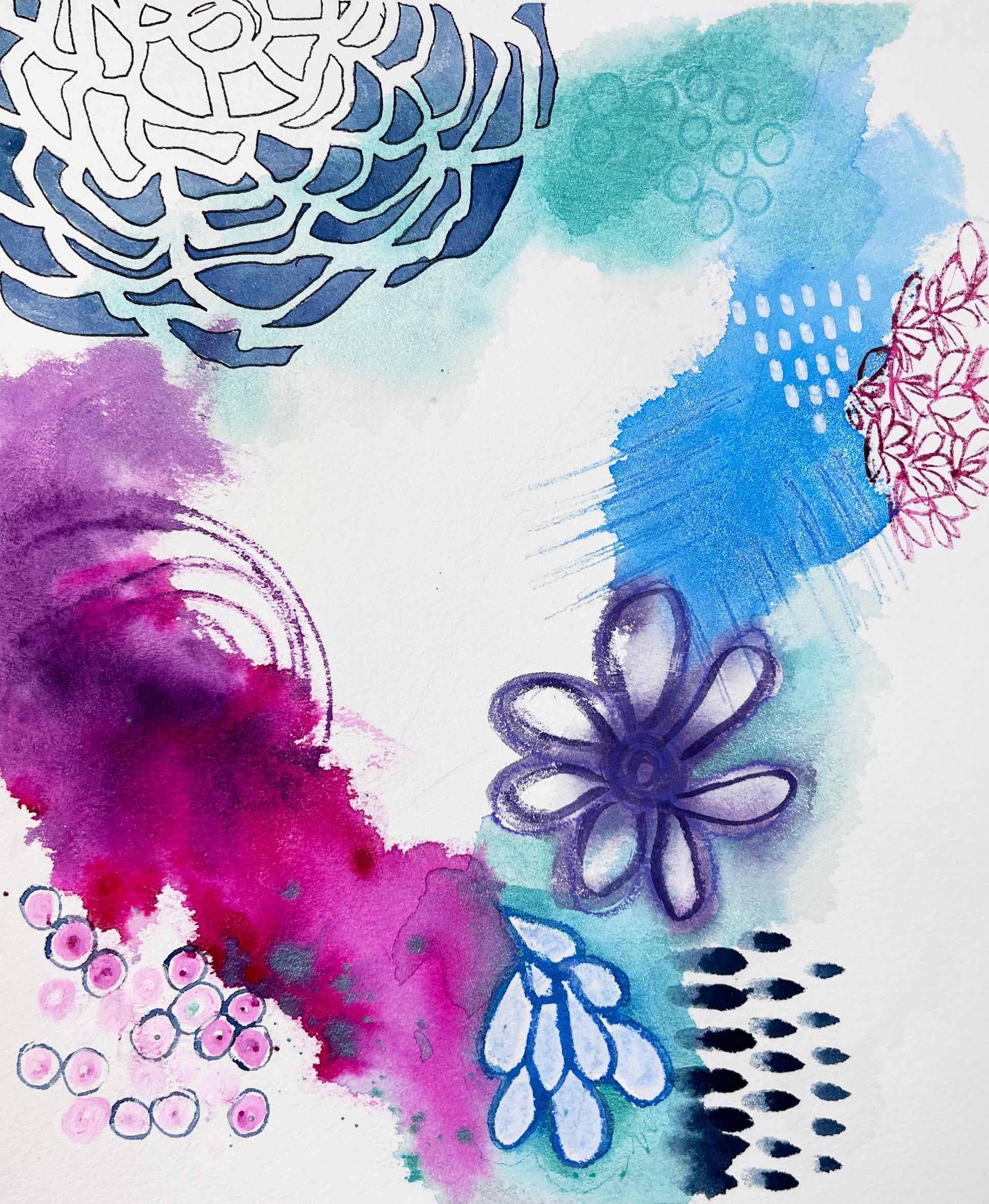 This artwork's a fiesta for your eyes! Colorful scribbles and playful doodles dance with vivid ink splashes, all set to a rhythm of geometric shapes and botanical sketches. It's pure fun on watercolor paper. Let yourself be swept away by this explosion of color and creativity.
