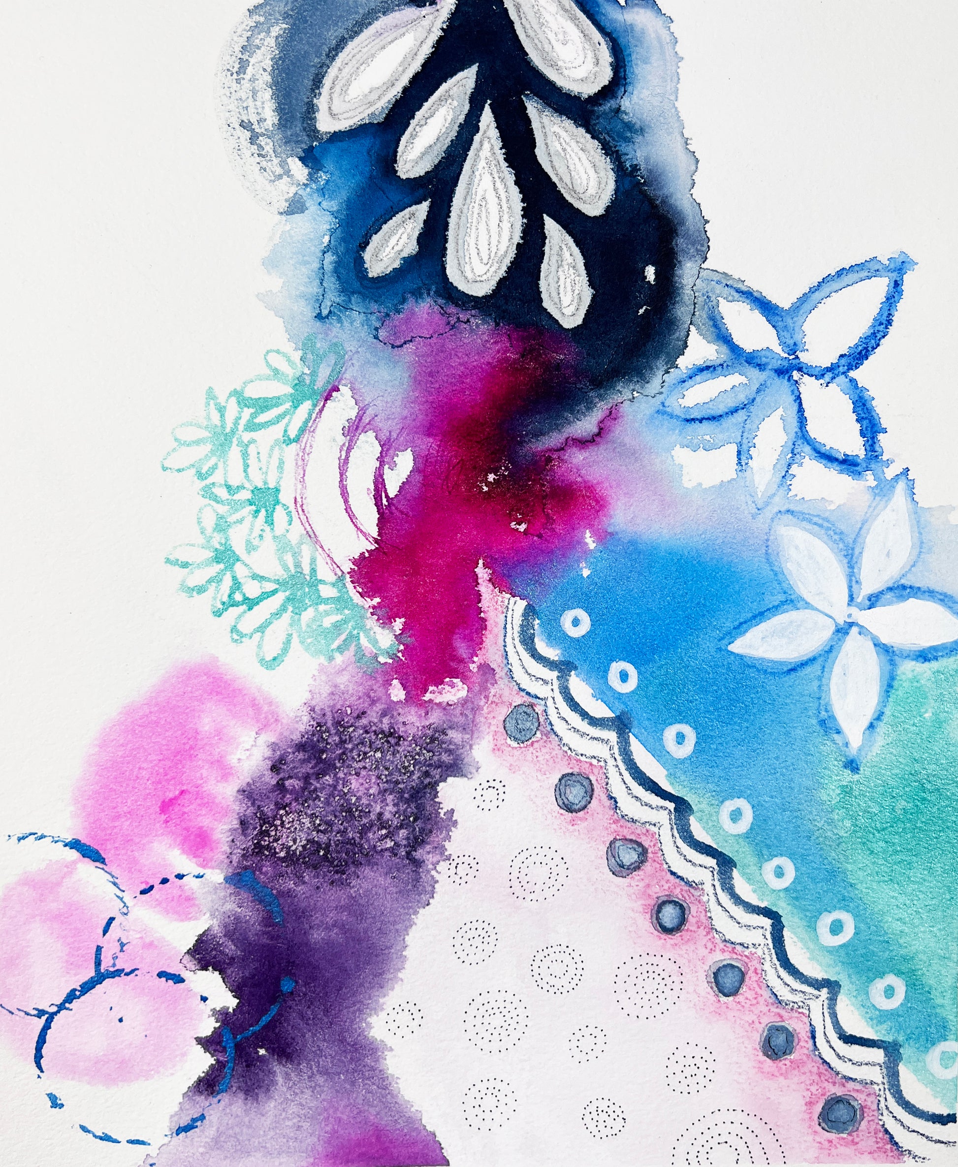 This artwork's a fiesta for your eyes! Colorful scribbles and playful doodles dance with vivid ink splashes, all set to a rhythm of geometric shapes and botanical sketches. It's pure fun on watercolor paper. Let yourself be swept away by this explosion of color and creativity.