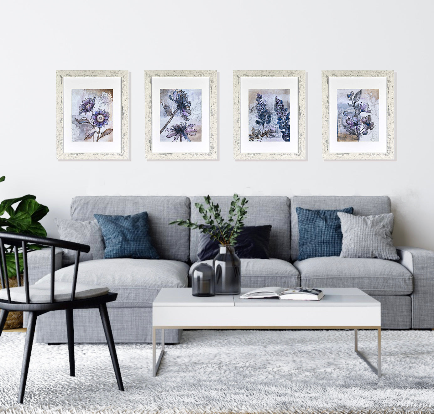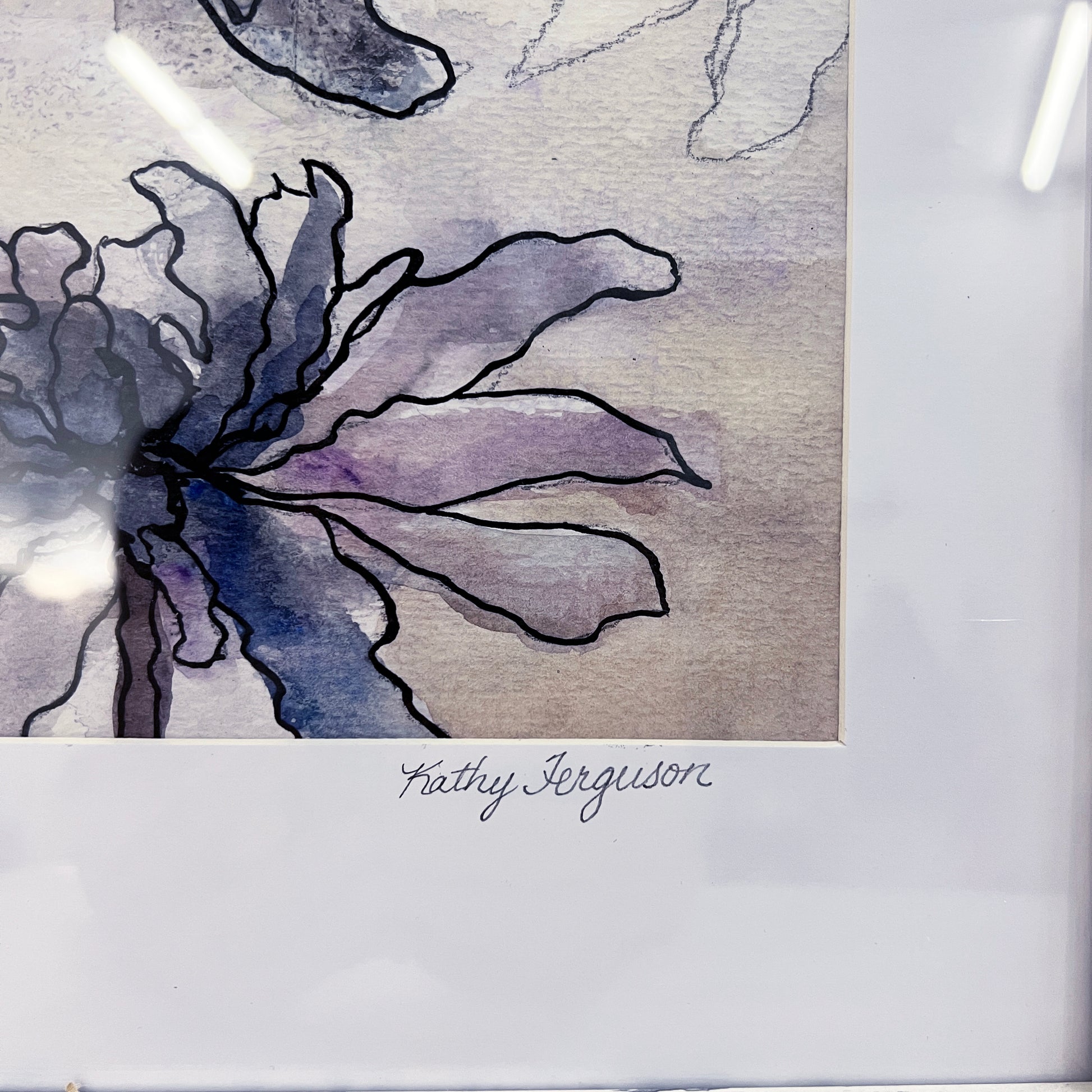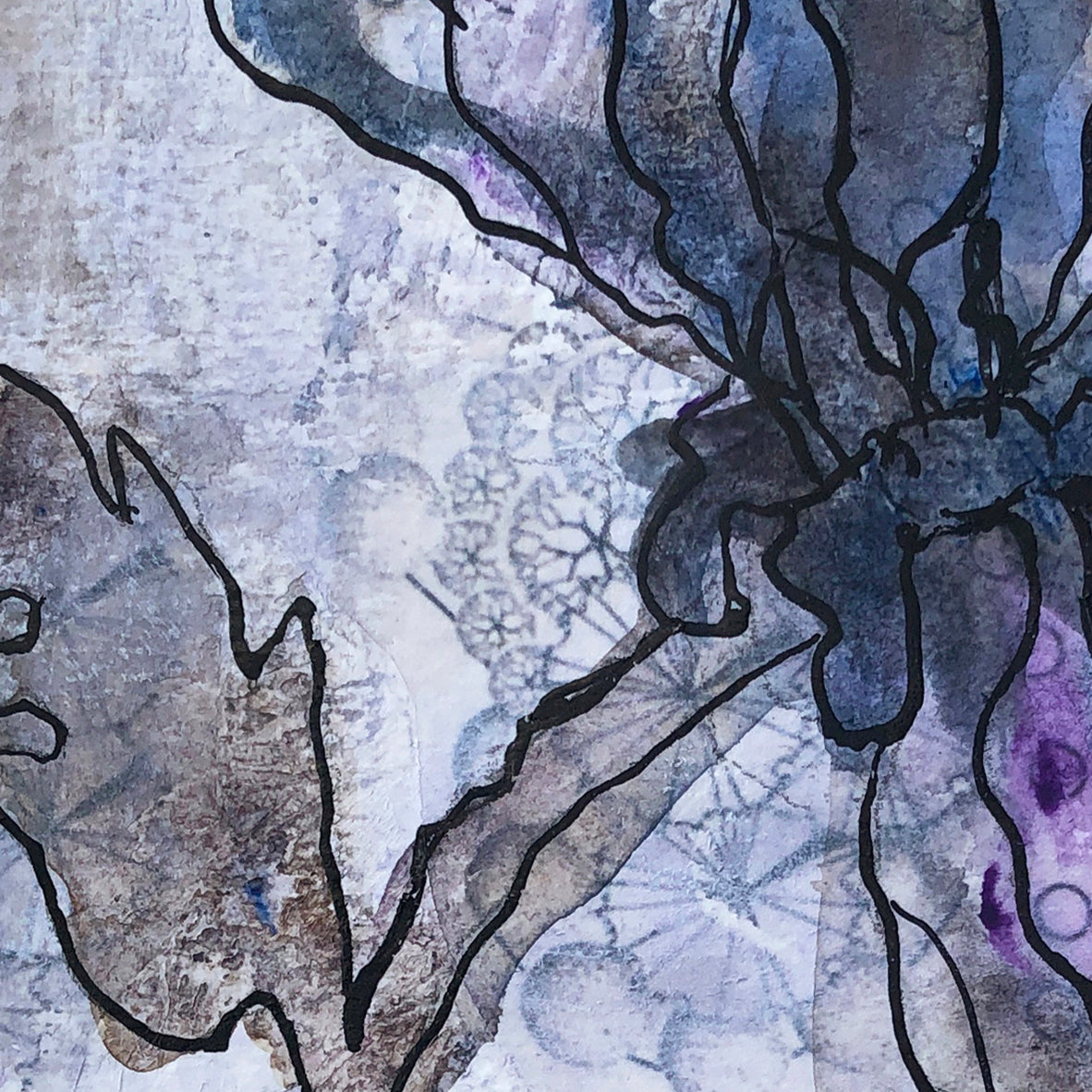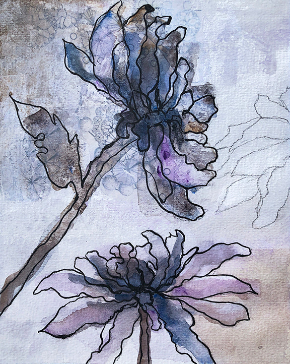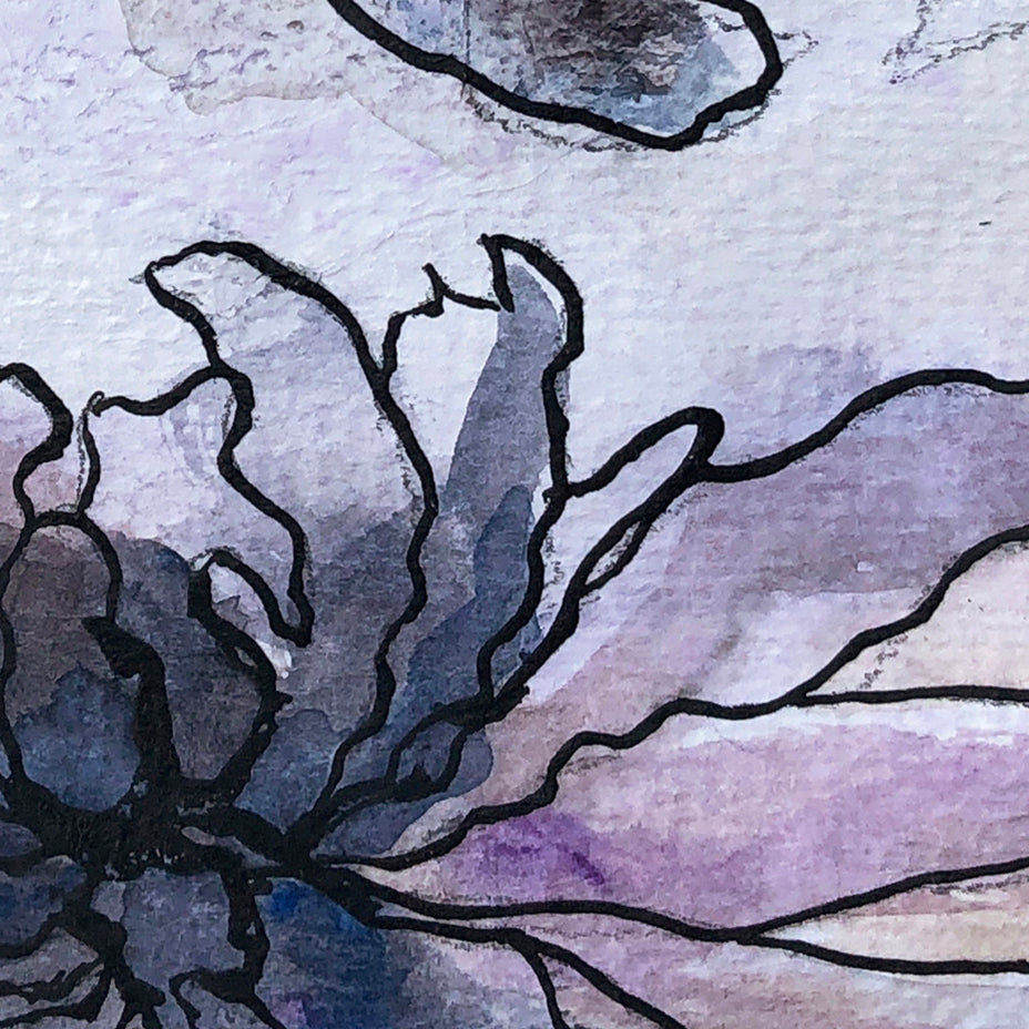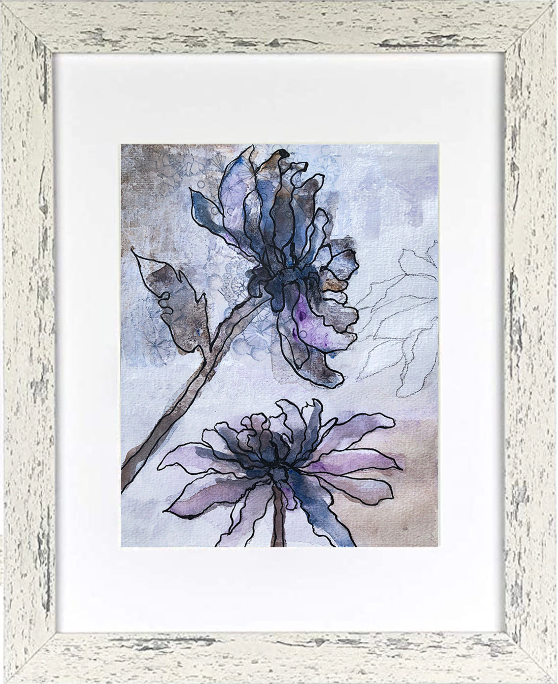 “Chrysanthemum” is a softly purple-tinted mixed media flower painting. Created with collage paper, transfers, acrylic, watercolors, and India ink. It is one in a collection of four flower paintings. All four paintings look beautiful and cohesive when hung together.