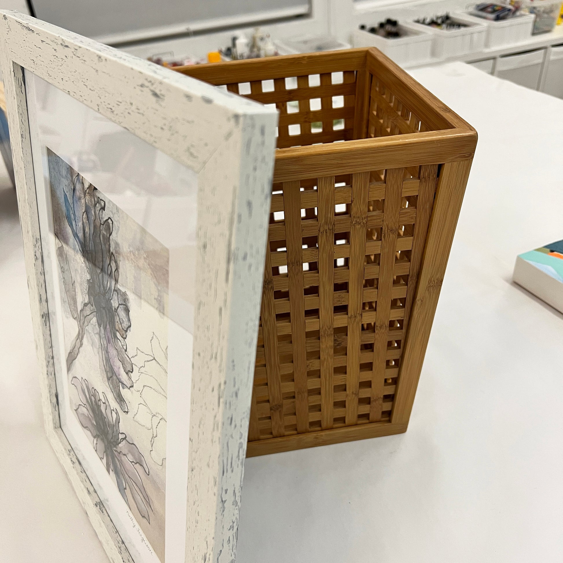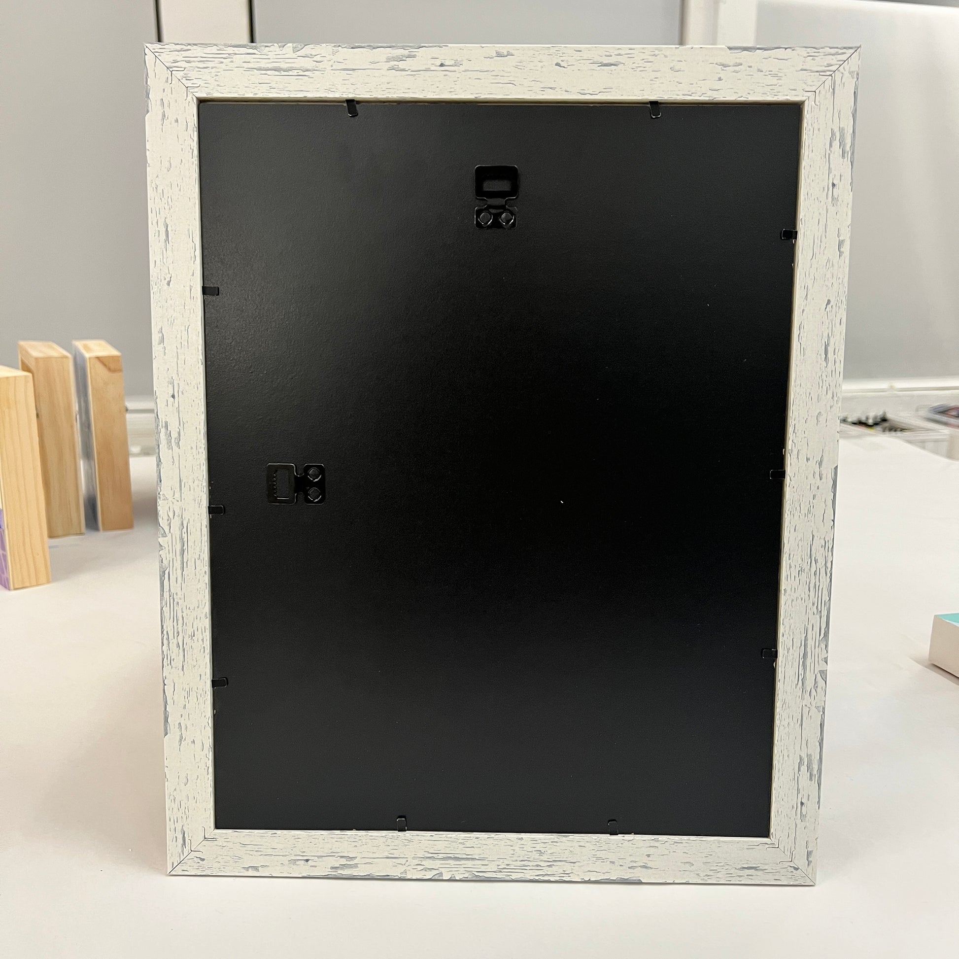 10" x 8" on paper, white-washed frame with white mat. Framed image 15" x 13"