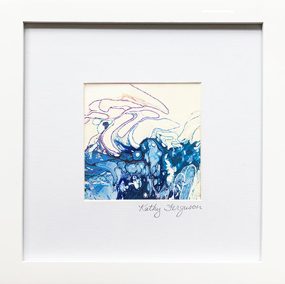 Cresting Wave is a small, framed, and matted acrylic painting behind glass. I use a sophisticated technique of pouring paint with added chemicals to create luscious intermixed bubbles and waves of color. Paints are selected based on the opacity, density, and color mixing properties of each color, with chemicals added to some (but not all) of them. The paint blends are poured onto Graphix film in layers, tipping and tilting to get the effect I'm after. A butane torch is used to get chemicals to rise to the surface and create cells of color to bubble up.