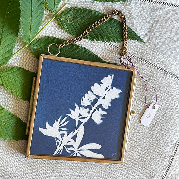 These original cyanotype ornaments were created from the native plants I found while hiking the high alpine trails of Colorado. Each unique print is encased in a bright gold frame between layers of glass and hangs from a gold link chain. Ornaments are wrapped individually in gold-speckled tissue paper and placed in a gold-foiled pouch. My signature and the creation year are on each print's back.