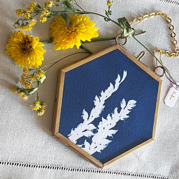 I created these original cyanotype ornaments from native plants I found while hiking the high alpine trails of Colorado. Each unique print is encased in a bright gold frame between layers of glass and hangs from a gold link chain. Ornaments are wrapped individually in gold-speckled tissue paper and placed in a gold-foiled pouch. My signature and the creation year are on each print's back.