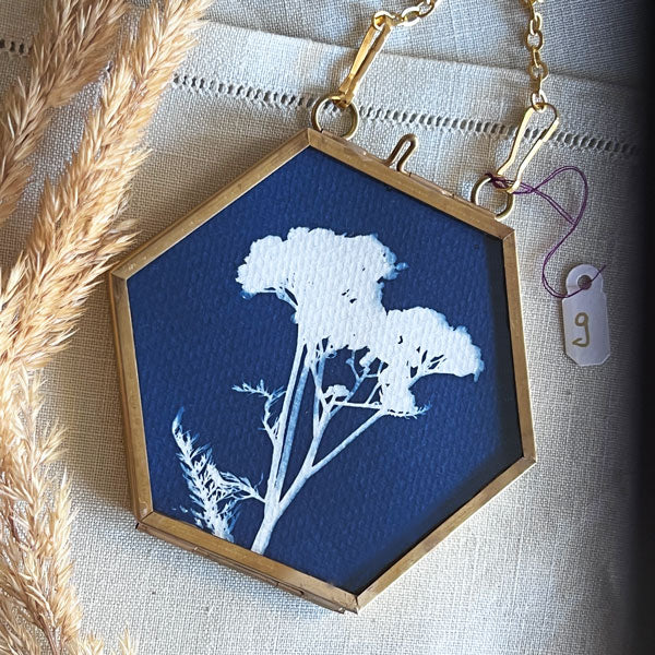 I created these original cyanotype ornaments from native plants I found while hiking the high alpine trails of Colorado. Each unique print is encased in a bright gold frame between layers of glass and hangs from a gold link chain. Ornaments are wrapped individually in gold-speckled tissue paper and placed in a gold-foiled pouch. My signature and the creation year are on each print's back.
