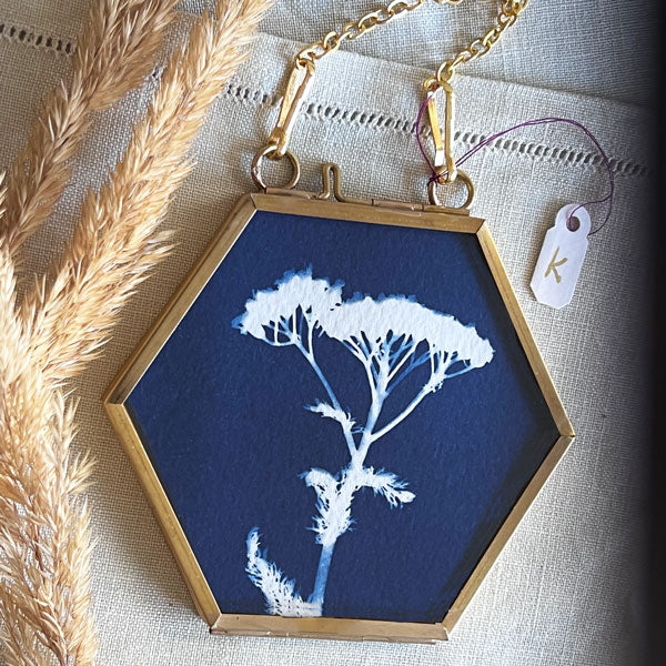 I created these original cyanotype ornaments from native plants I found while hiking the high alpine trails of Colorado. Each unique print is encased in a bright gold frame between layers of glass and hangs from a gold link chain. Ornaments are wrapped individually in gold-speckled tissue paper and placed in a gold-foiled pouch. My signature and the creation year are on each print's back.