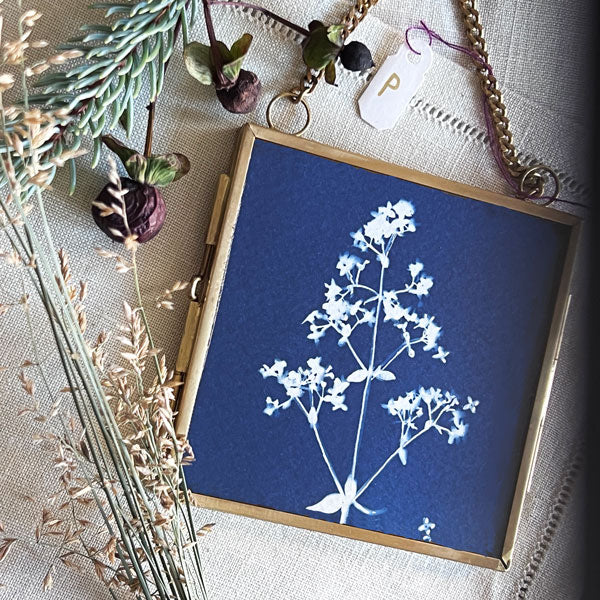 I created these original cyanotype ornaments from native plants I found while hiking the high alpine trails of Colorado. Each unique print is encased in a bright gold frame between layers of glass and hangs from a gold link chain. Ornaments are wrapped individually in gold-speckled tissue paper and placed in a gold-foiled pouch. My signature and the creation year are on each print's back.