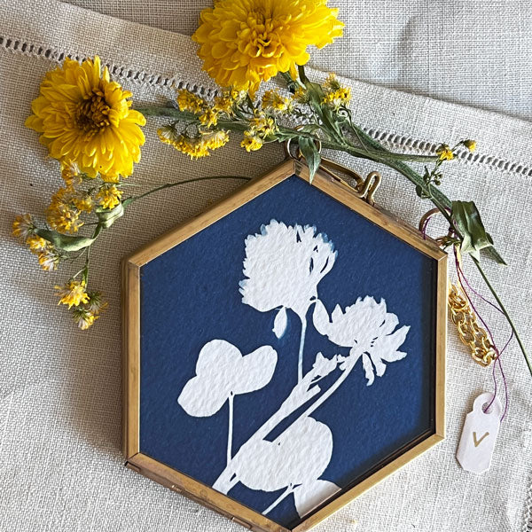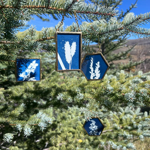 I created these original cyanotype ornaments from native plants I found while hiking the high alpine trails of Colorado. Each unique print is encased in a bright gold frame between layers of glass and hangs from a gold link chain. Ornaments are wrapped individually in gold-speckled tissue paper and placed in a gold-foiled pouch. My signature and the creation year are on each print's back.