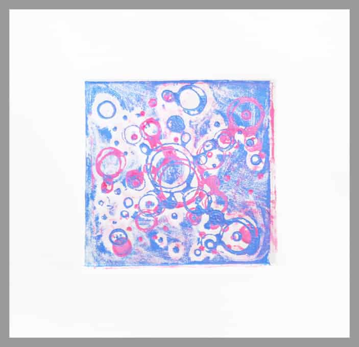 I created two printing plates with raised textured circles using carborundum powder. I then printed layers of blue and pink ink on paper to make this animated image of floating soap bubbles. What do you see?