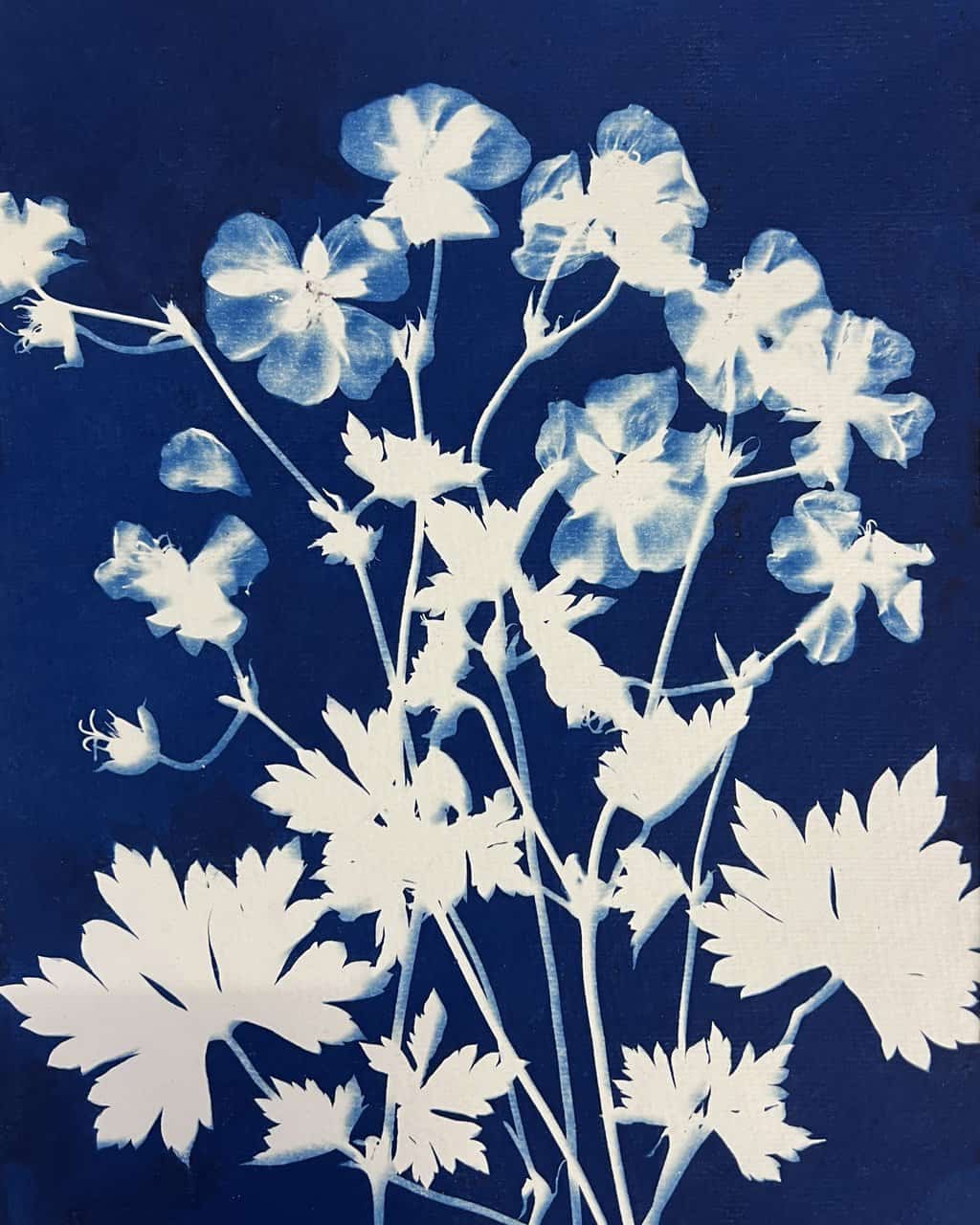 Geranium Rozanne One is an original cyanotype on archival watercolor paper. These delicate perennials grow in my Colorado high alpine garden. I love them for their abundant purple flowers overrun my garden in September. The deer hate them, so they don't eat them either, another plus!