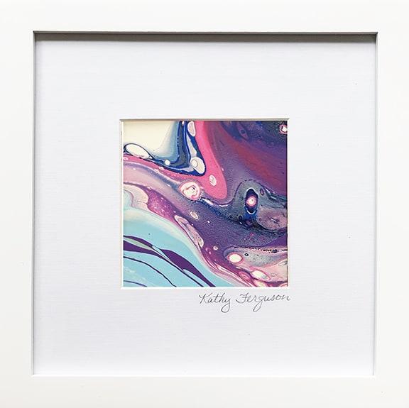 Intermingle is a small, framed and matted acrylic painting behind glass. I begin by selecting my paints, taking into account the opacity, density, and color mixing properties of each color. I add floetrol (an additive that improves the flow and leveling of paint) and silicone. The big moment comes when I pour the liquid concoction onto Graphix film, tilting and tipping to get the look I want. I use a butane torch to get cells of color to bubble up to the surface.