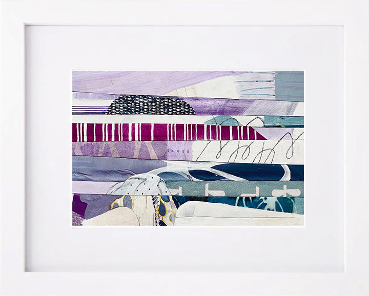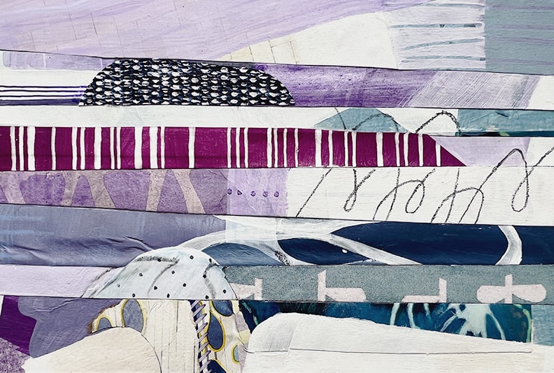 Nantucket Afternoon is a collage painting about one of my favorite places. The pink and purple colors flash by as I bike by the blooming hydrangea bushes. The salty brine of the deep blue Atlantic that I smell while enjoying the succulent taste of a warm buttered lobster roll.