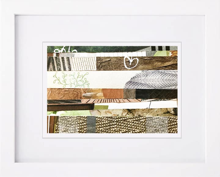 Nature Medley One is the first of a pair of companion paintings. It is a soothing abstract nature collage painting depicting the serene tones of wood, wool, and leaves.