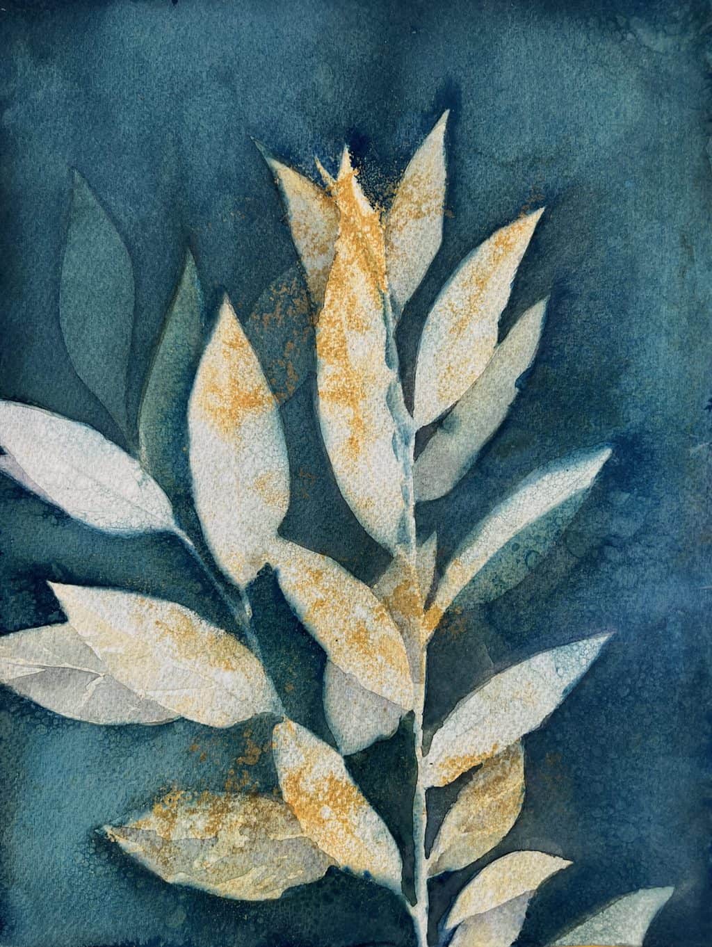 Cyanotypes are one of photography's oldest printing processes. The distinctive feature of its prints is its shade of cyan blue, which results from its exposure to ultraviolet light. I have used plants from my garden to block the UV-rays and create unique, botanical silhouettes. Additional chemicals, dyes, and watercolor are added to create a truly one-of-a-kind artwork.