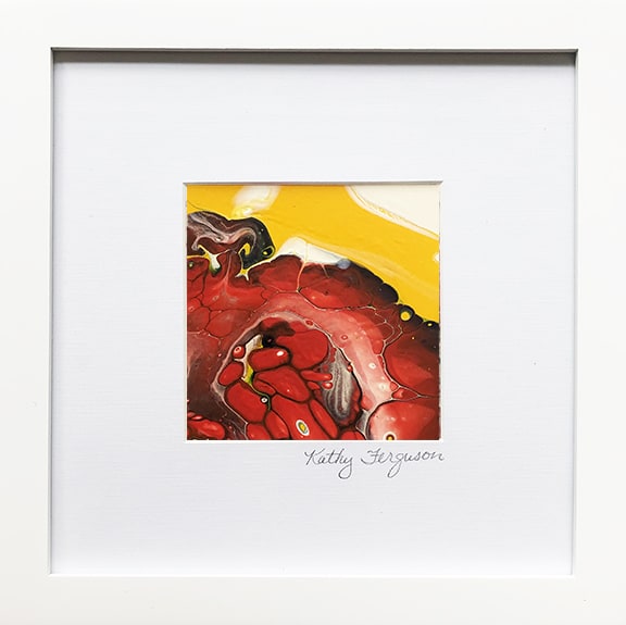 Oxygenated is small, framed acrylic paintings I begin by selecting my paints, taking into account the opacity, density, and color mixing properties of each color. I add floetrol (an additive that improves the flow and leveling of paint) and silicone. The big moment comes when I pour the liquid concoction onto Graphix film, tilting and tipping to get the look I want. I use a butane torch to get cells of color to bubble up to the surface.