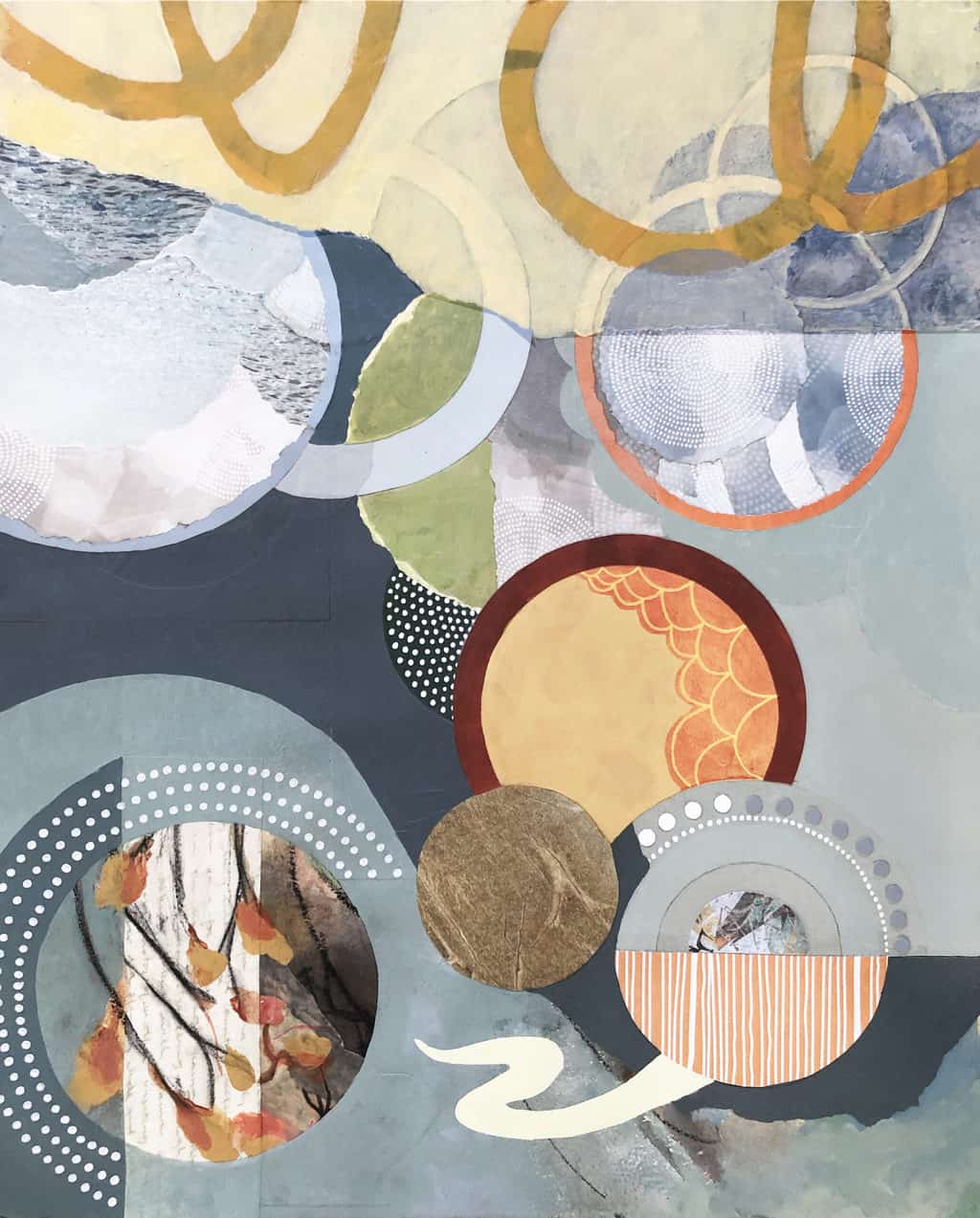 This painting captures the autumn of my childhood. Memories of cooler temperatures, changing colors, and shortening days all rush back to me. There's a nostalgia for those foggy beach days with crisp winds and washed-up seaweed—a pang of sadness for the dropping leaves and impending winter weather. These circles are portholes to my youth and bittersweet remembrances of those long-ago autumn days.
