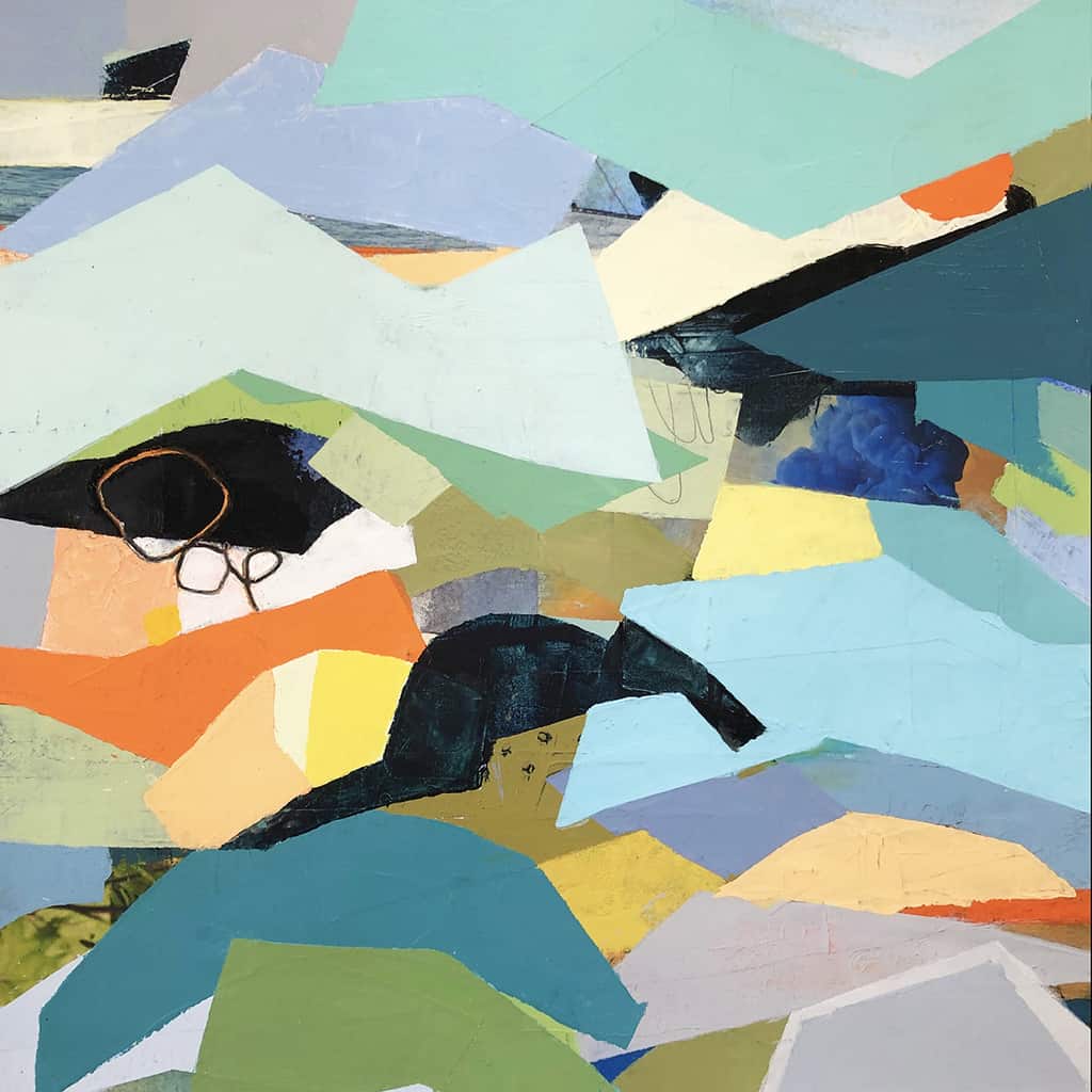 Sharp Edges One is a joyful celebration of color and form. With more than a dozen layers of cold wax medium and collage paper, each colorful shape competes for the viewer's attention. Playful thin graphite lines are carved back through these layers to vie for notice too. There are three paintings in the "Sharp Edge" series.