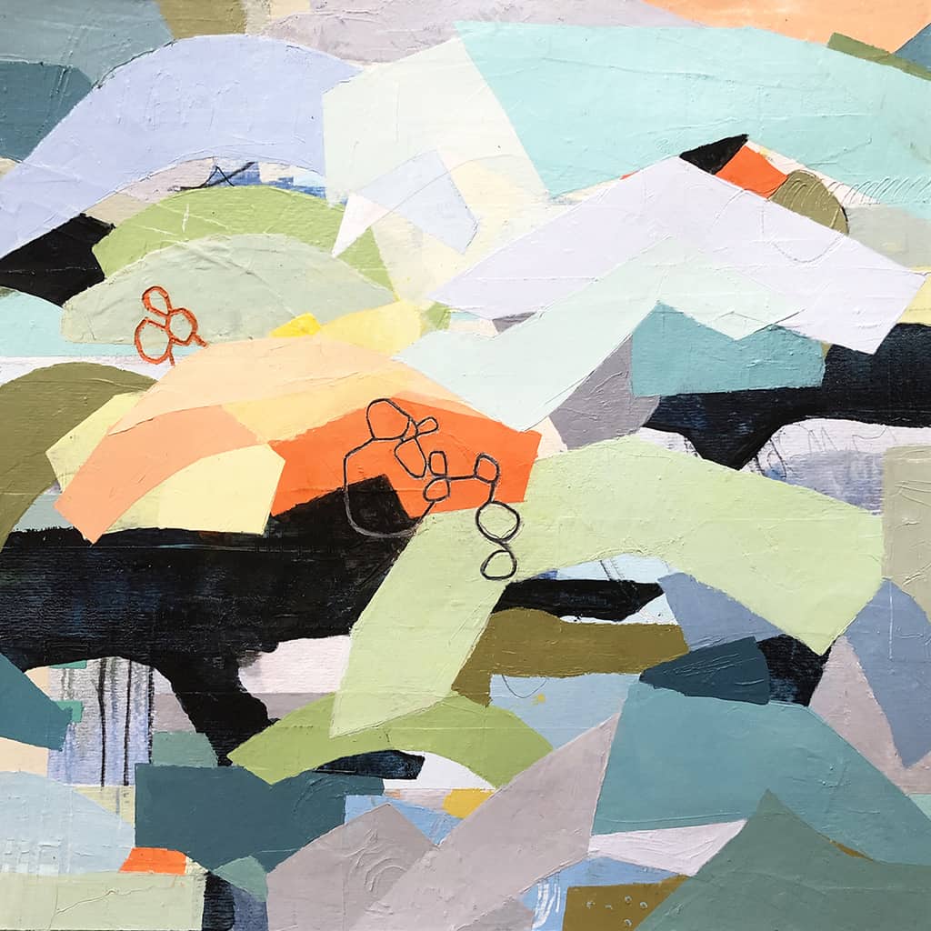 Sharp Edges Two is a joyful celebration of color and form. With more than a dozen layers of cold wax medium, each color competes for the viewer’s attention. Playful thin graphite lines are carved back through these layers to vie for attention. There are three paintings in the “Sharp Edge” series.