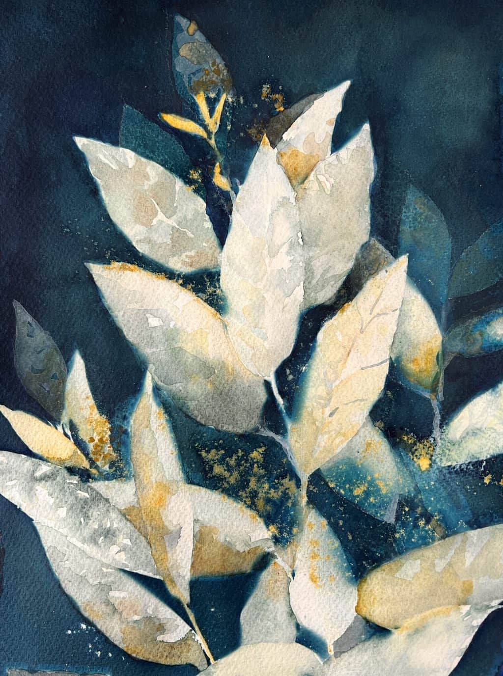 Cyanotypes are one of photography's oldest printing processes. Its prints' distinctive feature is its cyan blue shade, which results from its exposure to ultraviolet light. I have used plants from my garden to block the UV rays and create unique, botanical silhouettes. Additional chemicals, dyes, and watercolors are added to create a truly one-of-a-kind artwork.