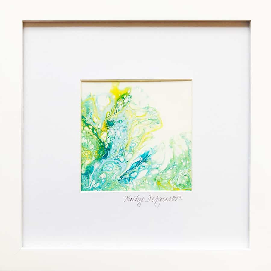 In Smoke Tendrils, I created the sinuous movement of the rising streams of colored smoke as they entwine their way to the sky. Smoke Tendrils is a small, framed and matted acrylic painting behind glass. I use a sophisticated technique of pouring paint with added chemicals to create luscious intermixed bubbles and waves of color. Paints are selected based on the opacity, density, and color mixing properties of each color, with chemicals added to some (but not all) of them. The paint blends are poured onto Graphix film in layers, tipping and tilting to get the effect I’m after. A butane torch is used to get chemicals to rise to the surface and create cells of color to bubble up.
