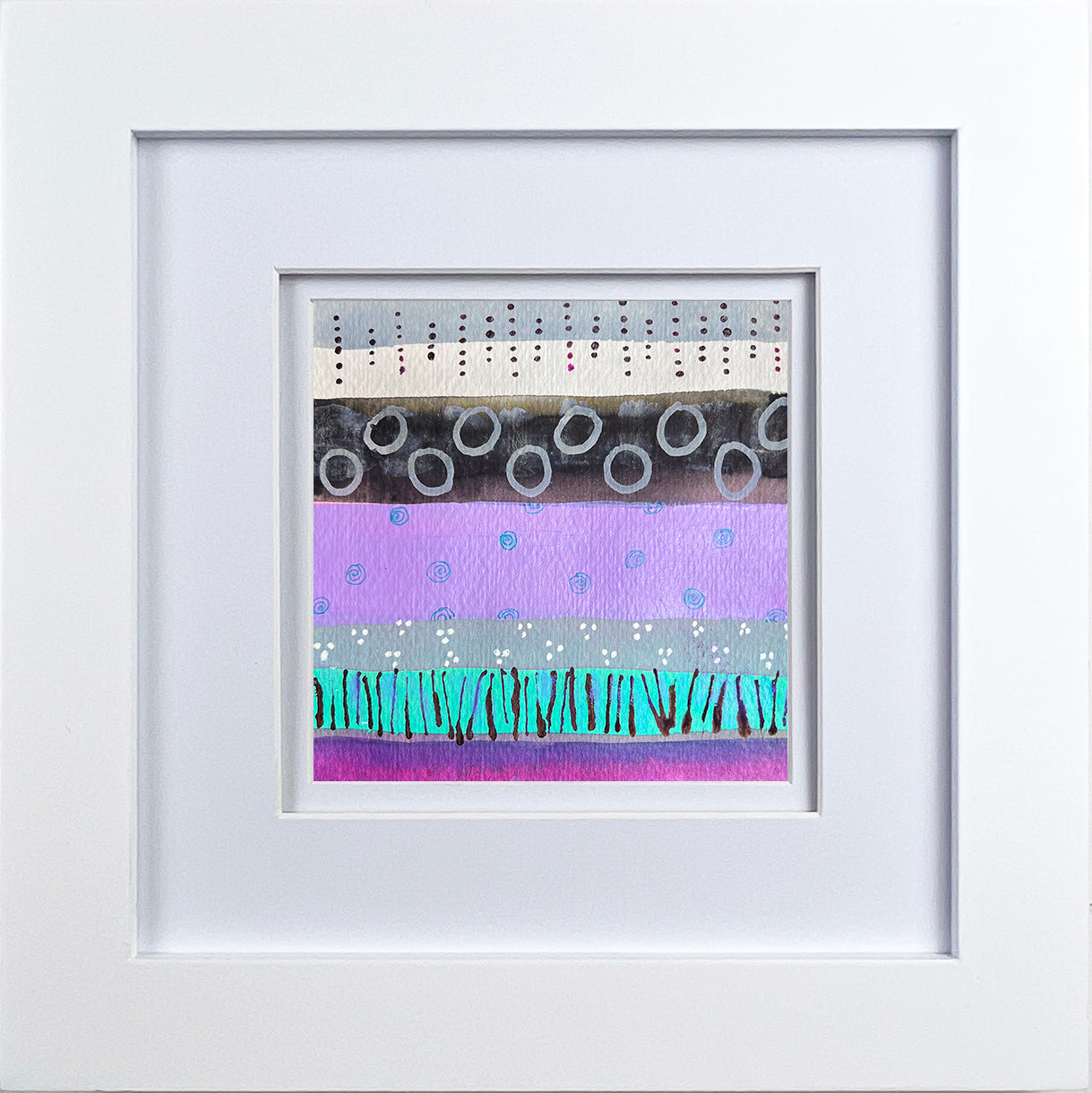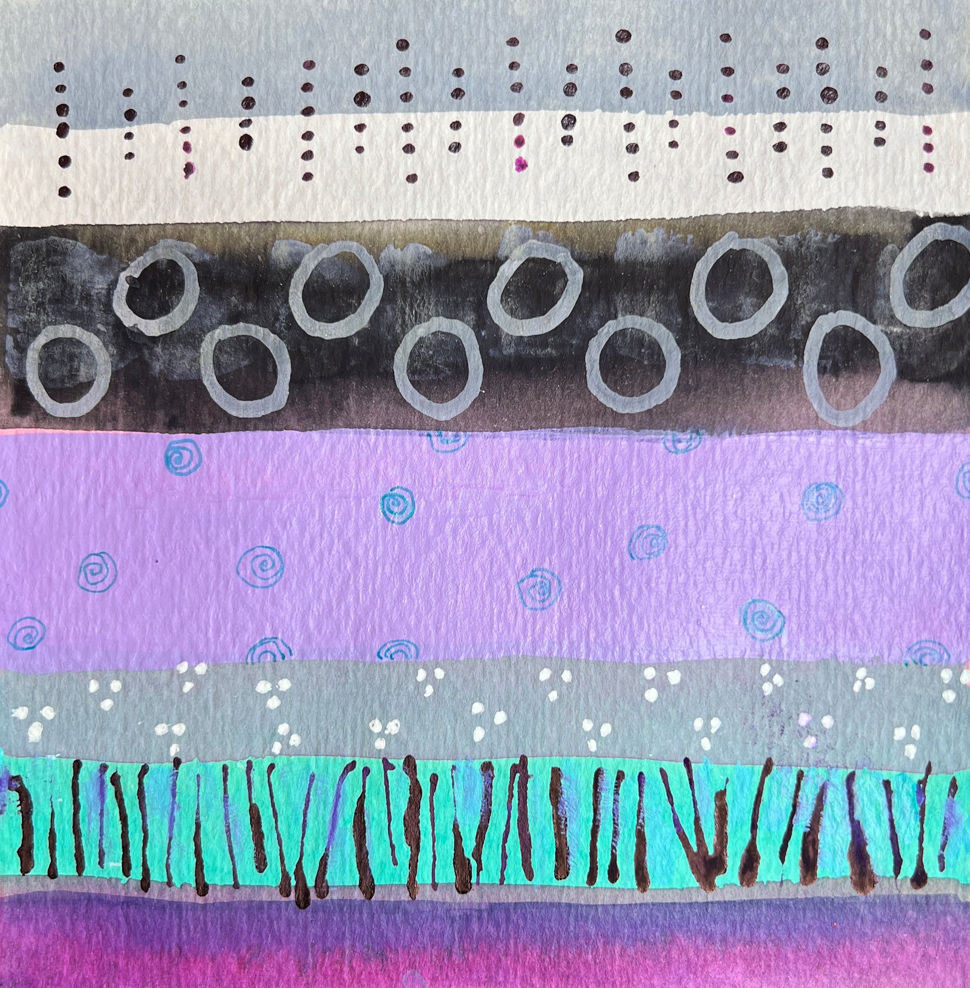 Creating this series of twelve stripe-paintings was a pure delight. Inspired by a childlike approach, each piece bursts with playful color combinations. I reveled in layering translucent hues, watching them blend and dance, whispering secrets of new shades. Simple doodles of dots, lines, and whimsy add a touch of charm to each canvas.