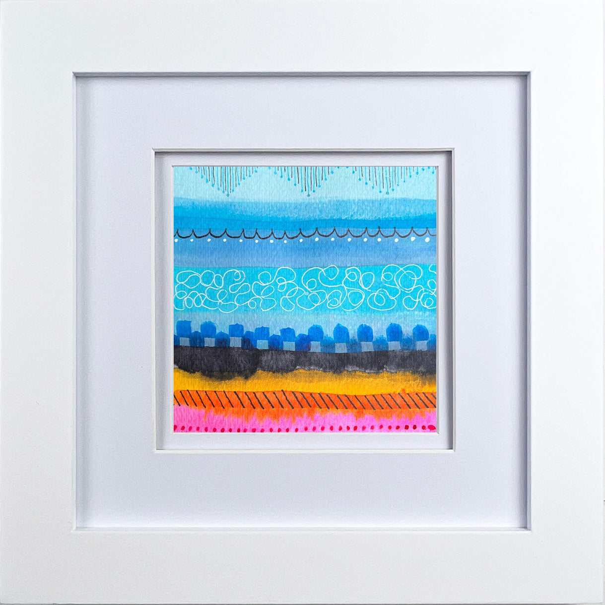 Creating this series of twelve stripe-paintings was a pure delight. Inspired by a childlike approach, each piece bursts with playful color combinations. I reveled in layering translucent hues, watching them blend and dance, whispering secrets of new shades. Simple doodles of dots, lines, and whimsy add a touch of charm to each canvas.