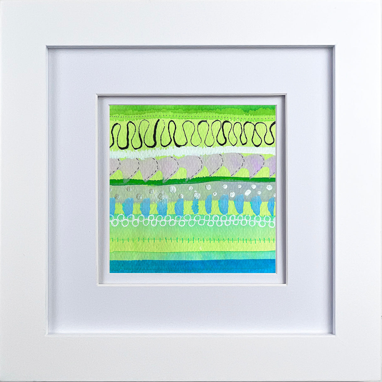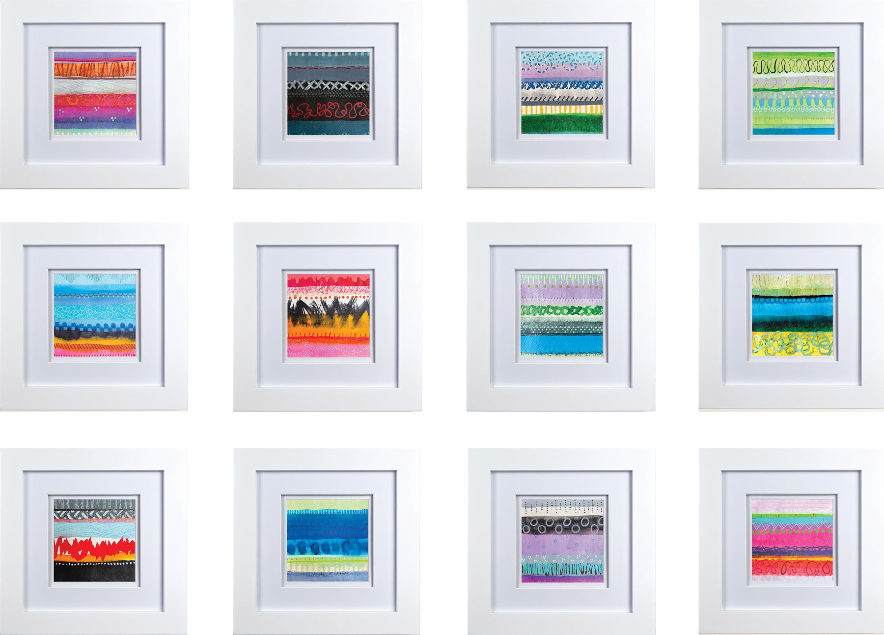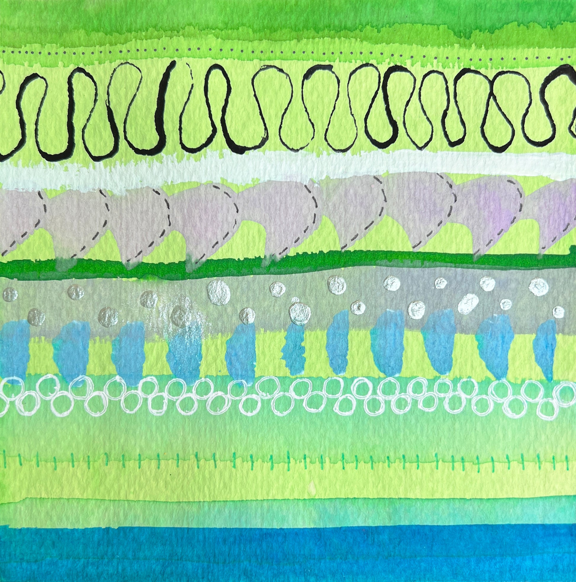 Creating this series of twelve stripe-paintings was a pure delight. Inspired by a childlike approach, each piece bursts with playful color combinations. I reveled in layering translucent hues, watching them blend and dance, whispering secrets of new shades. Simple doodles of dots, lines, and whimsy add a touch of charm to each canvas.