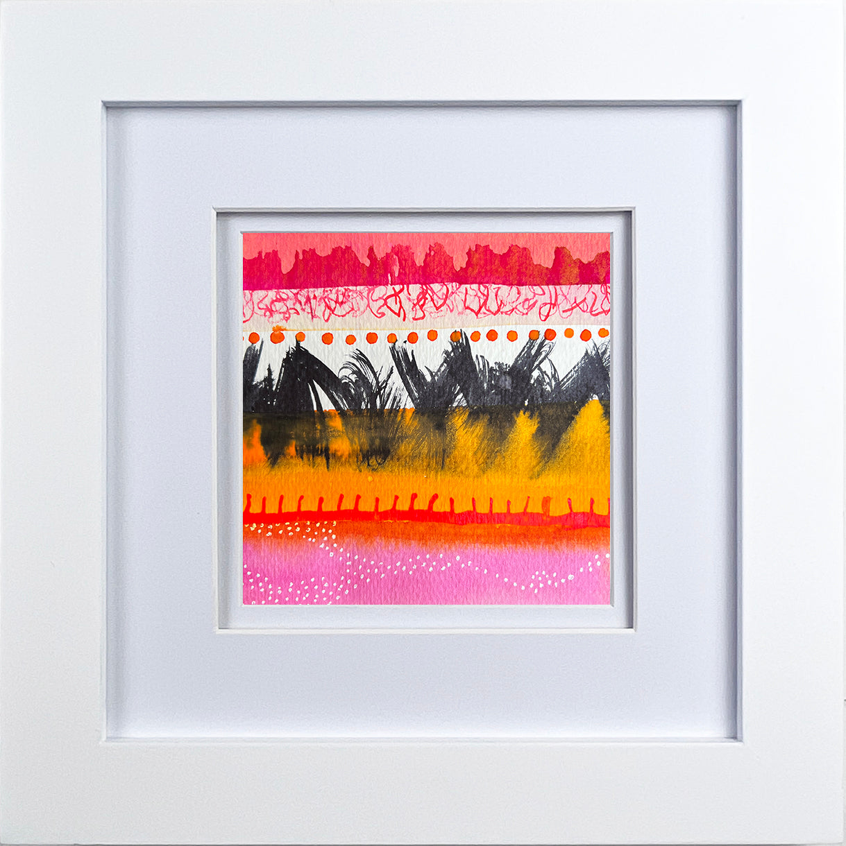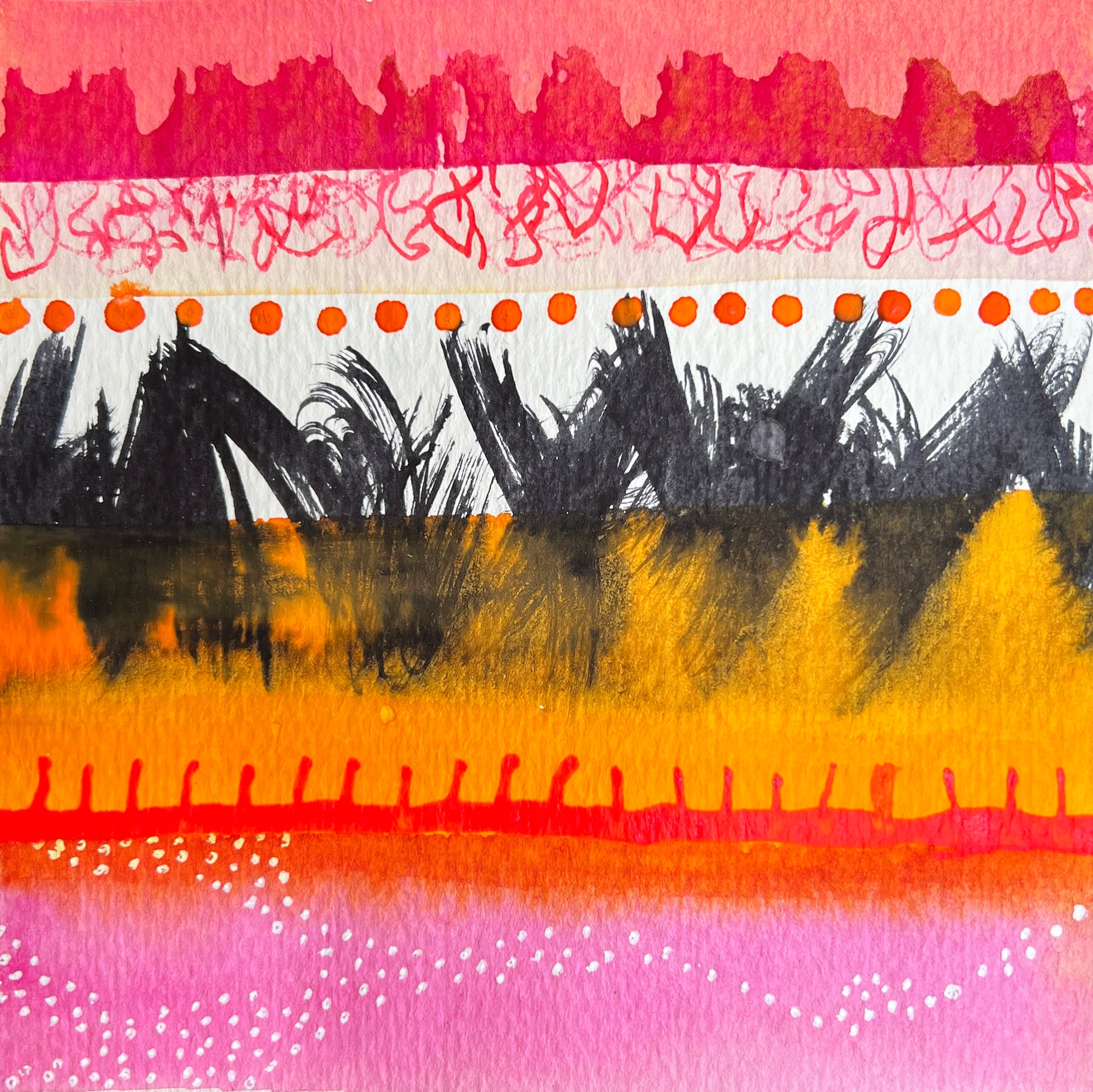 Creating this series of twelve stripe-paintings was a pure delight. Inspired by a childlike approach, each piece bursts with playful color combinations. I reveled in layering translucent hues, watching them blend and dance, whispering secrets of new shades. Simple doodles of dots, lines, and whimsy add a touch of charm to each canvas.