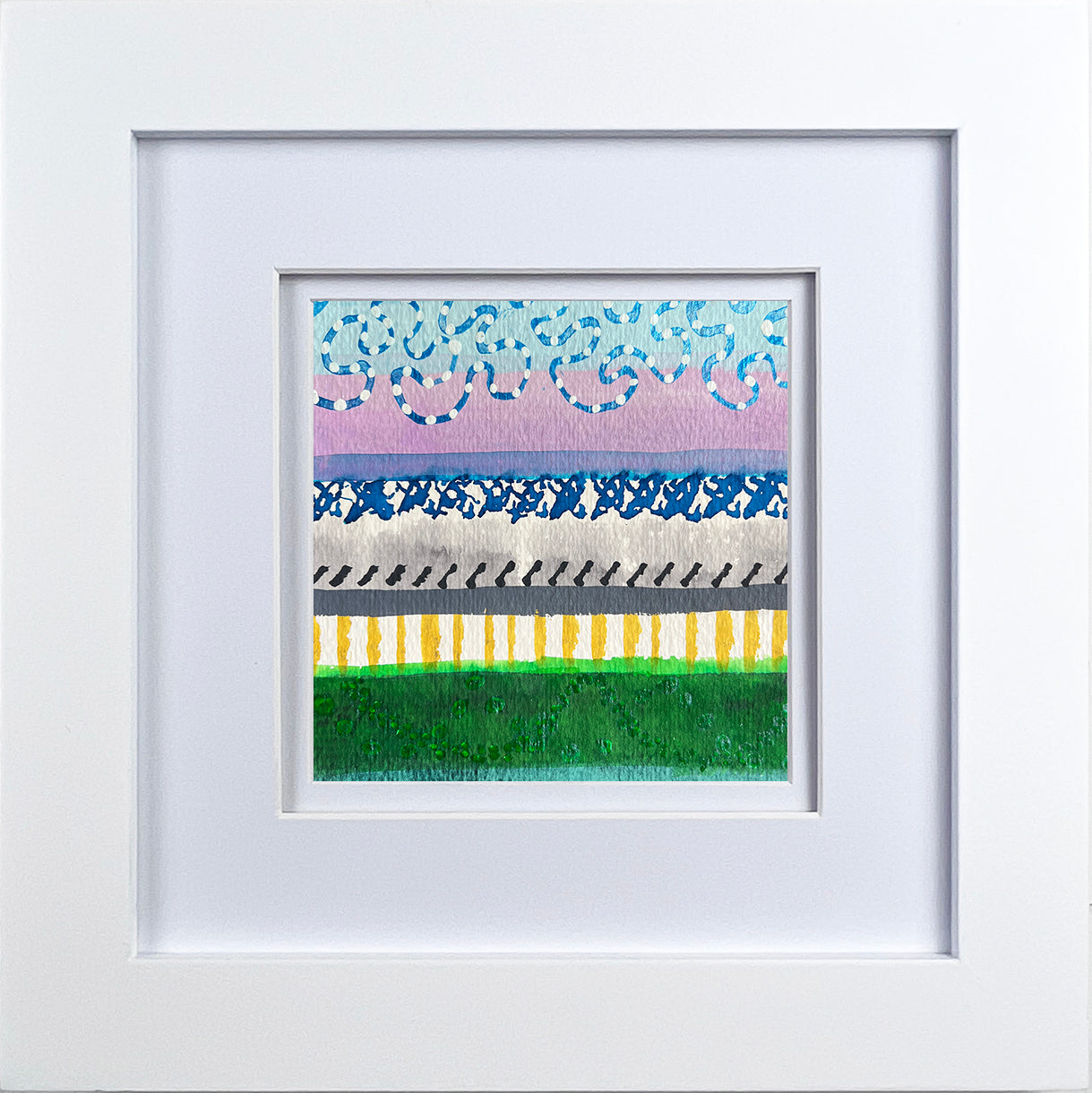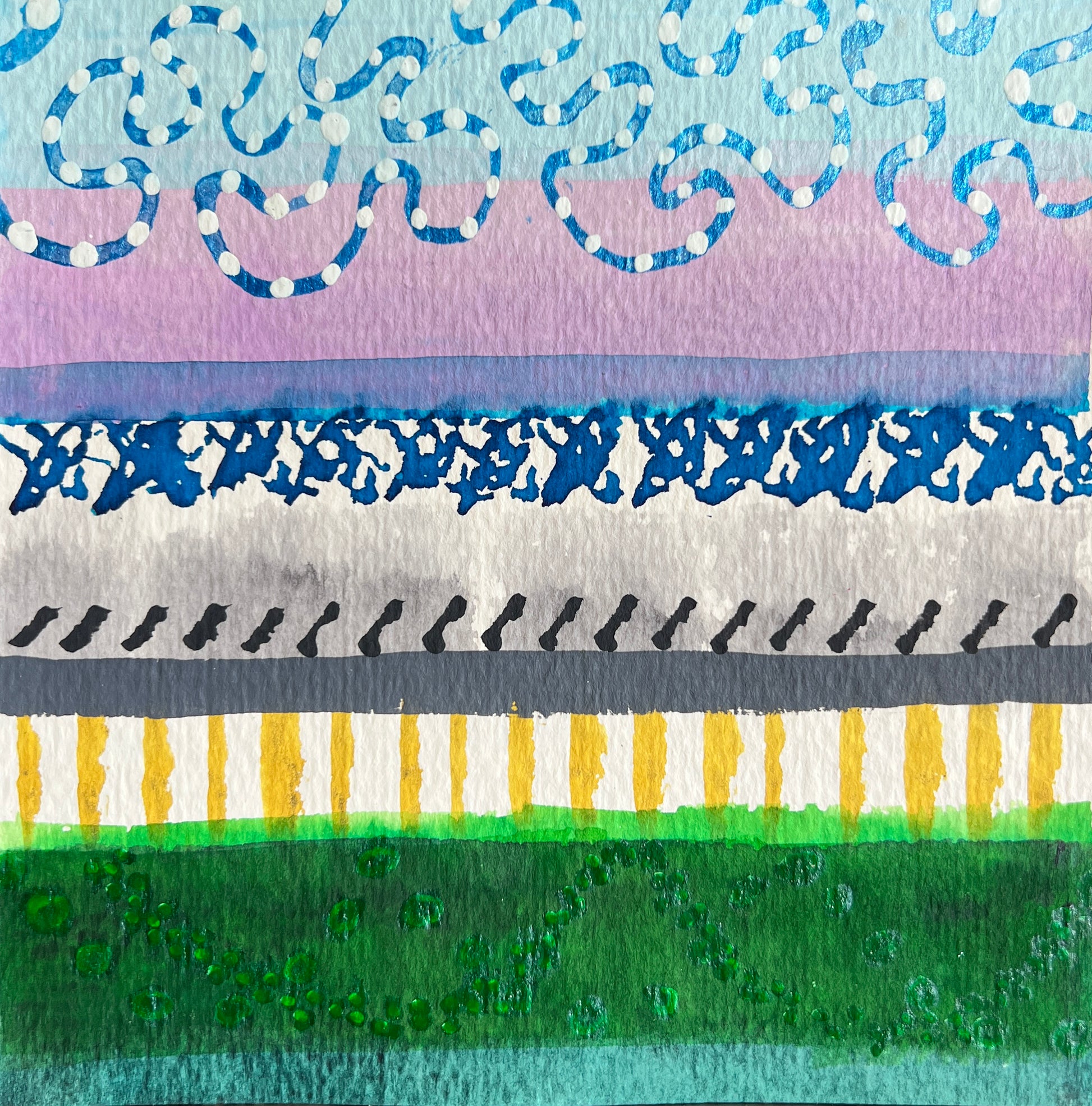 Creating this series of twelve stripe-paintings was a pure delight. Inspired by a childlike approach, each piece bursts with playful color combinations. I reveled in layering translucent hues, watching them blend and dance, whispering secrets of new shades. Simple doodles of dots, lines, and whimsy add a touch of charm to each canvas.