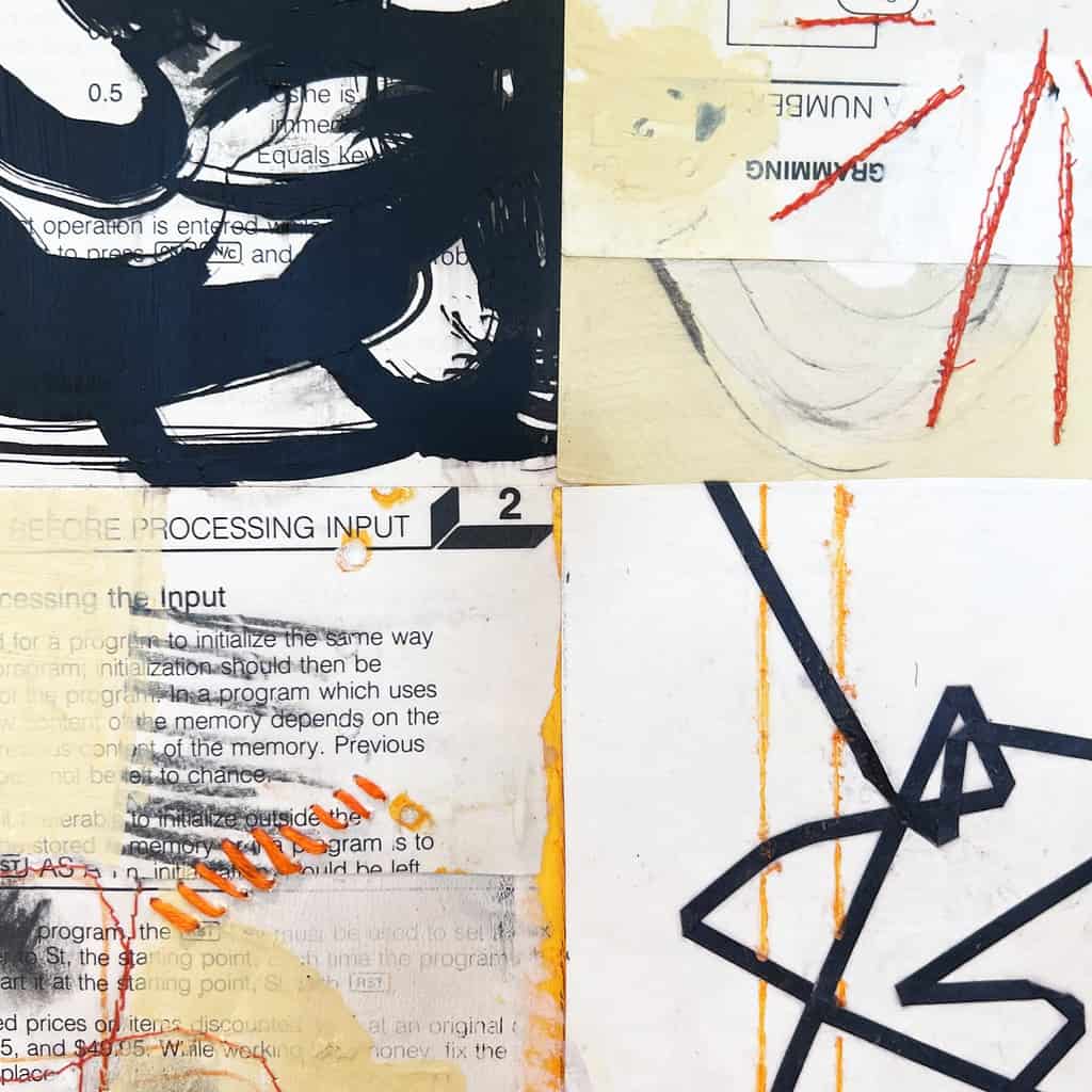 Book pages, acrylic, ink, embroidery floss, thread, and charcoal