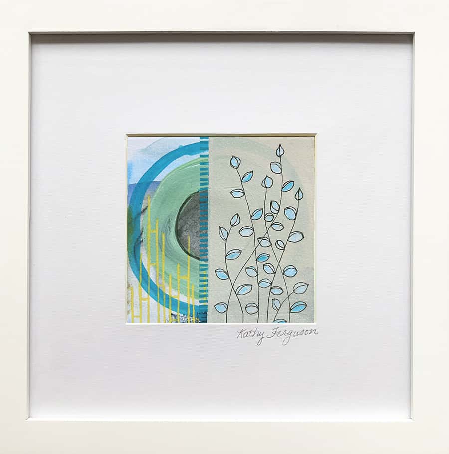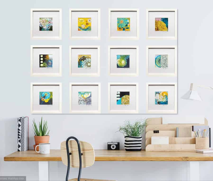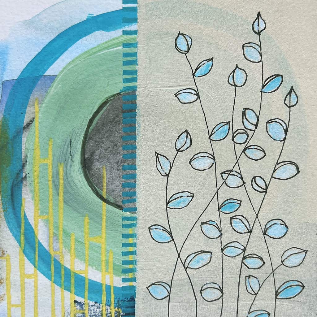 Wanting to embrace a more spontaneous and playful approach to my art process, I created a new series of mini paintings that focused on experimentation, play, and spontaneity. I worked on all twelve images simultaneously, starting each mini-painting with simple charcoal marks, allowing my hand to move freely across the canvas. Then, I added translucent washes, letting the early marks peek through and create depth. The next step was incorporating opaque acrylics and collage papers, adding vibrant pops of color and interesting textures. I know what you're thinking: this must have resulted in a chaotic mess. And you're not wrong! At this point, my paintings resembled a disorganized jumble of elements. But that's where the magic happened. I sat down with each one and let my intuition guide me. I asked myself, "What else does it need? What can I eliminate?" It was a process of refining and finding balance.