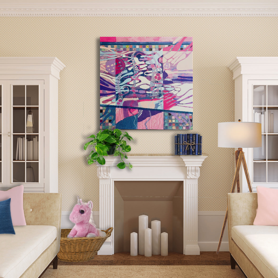 This painting salutes all persons (the little dots) taking to the streets to march for social justice. It has been an active year for women as we unite to bring political power to create transformative social change. The Women’s March and #MeToo movements have drawn attention to dismantling systems of oppression through nonviolent resistance and building inclusive structures guided by fairness, dignity, and respect.